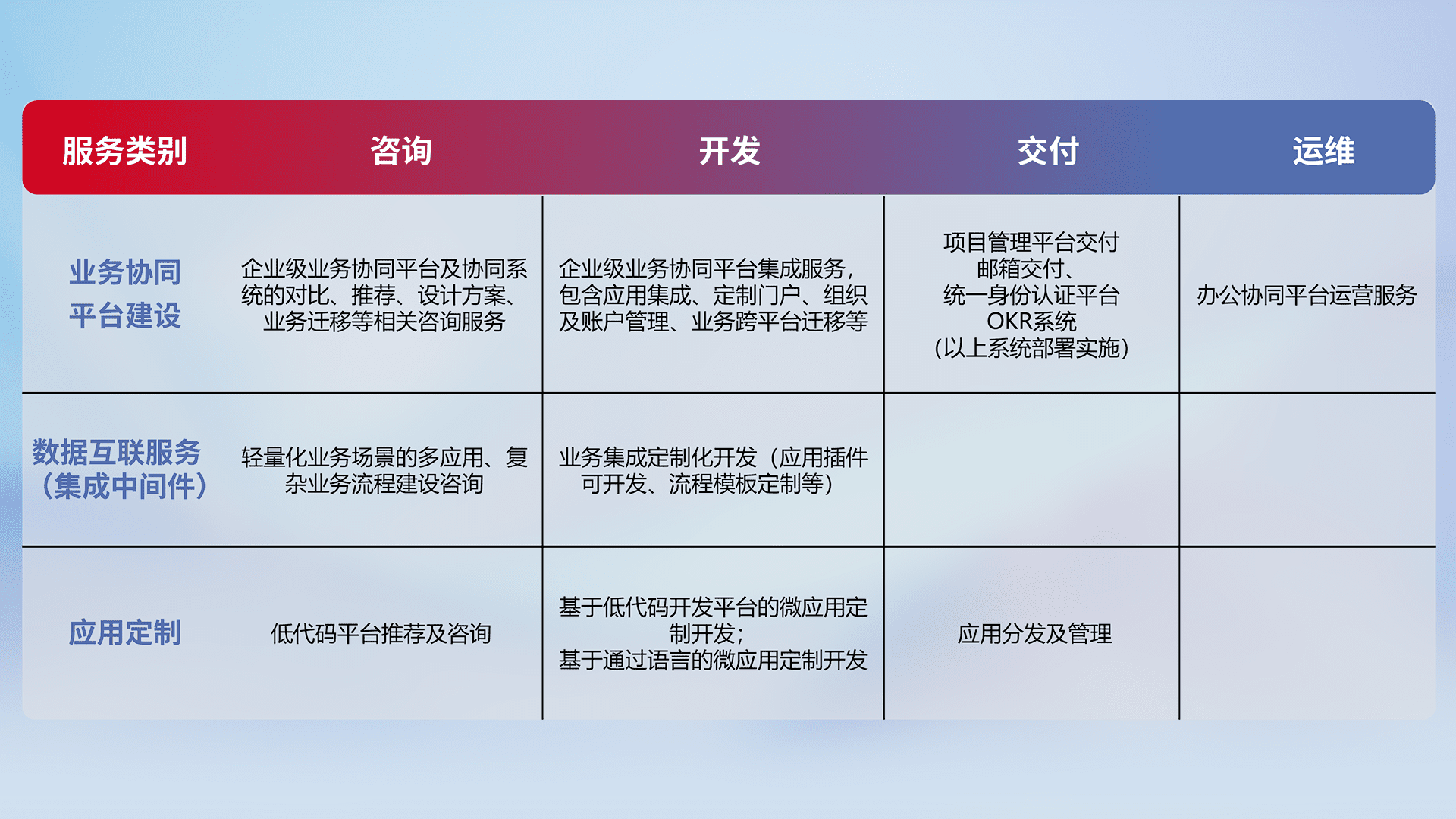 针对钉钉、、、企微、、、、IDaas等平台级产品提供产品的规划、、、、方案、、、交付、、、定制化开发等服务,,实现如统一协同办公、、、智能客户服务、、、混合会议管理、、、智能数据查询、、等业务场景,,,实现数字化转型。。